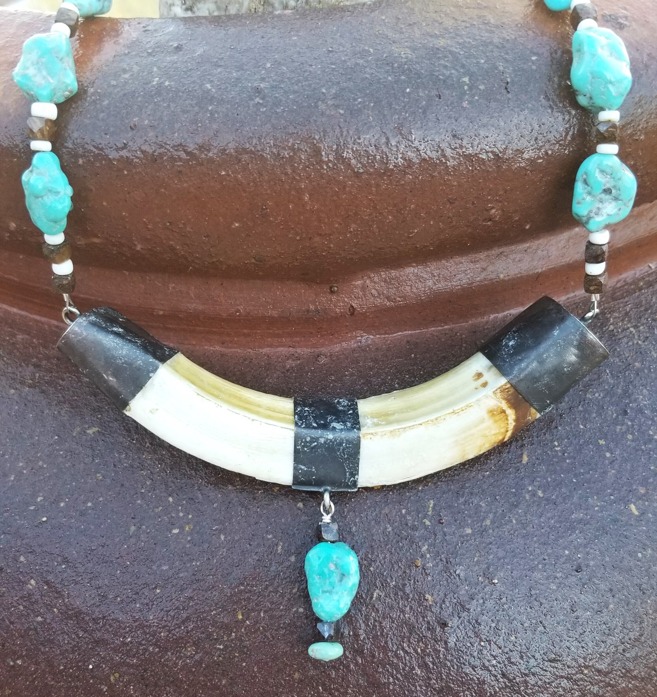 Dramatic bone and sizable Las Campitas turquoise nuggets are the stars of this unique necklace. The turuoise is offset with small beads of bronzite and bone. The bone pendant has wonderful coloration to it and is framed with a bronzed patinata metal. Below is a dangling bead of more turquoise to finish it off. Very comforable necklace to wear with a collared shirt or v-neck shirt. The clasp is a toggle style.