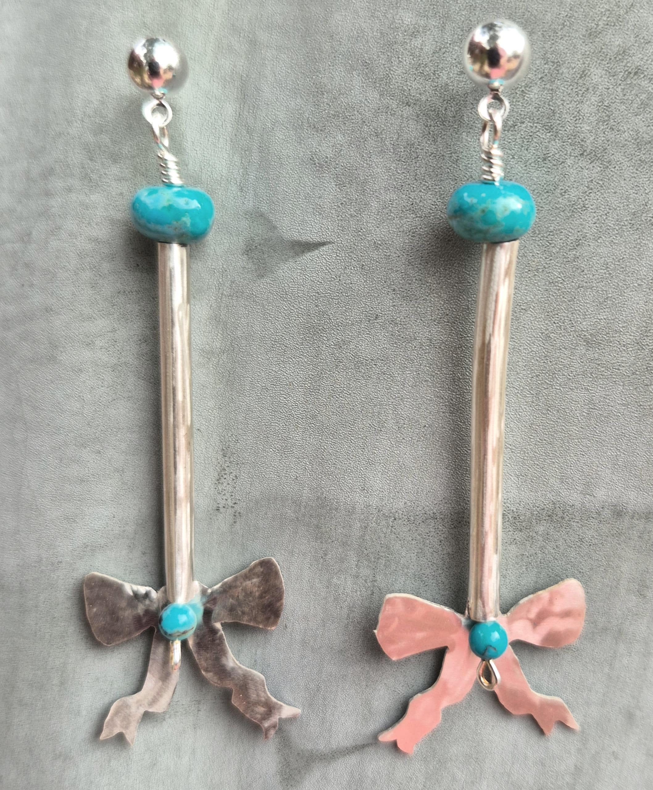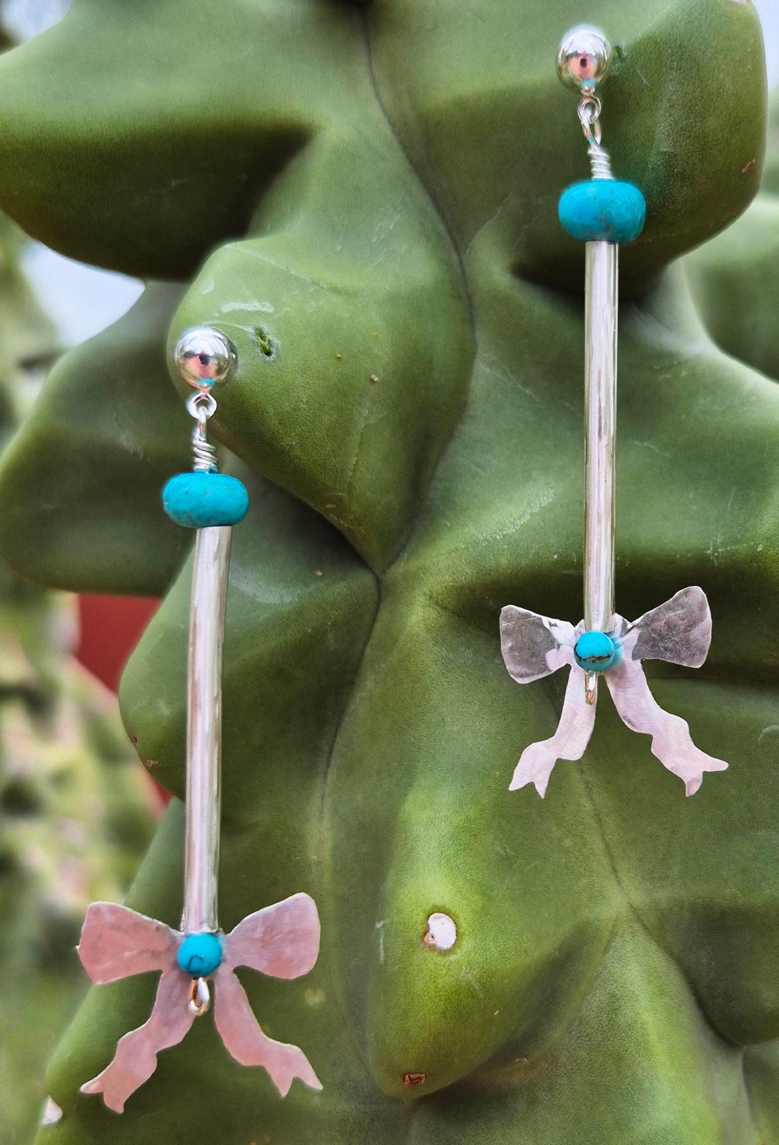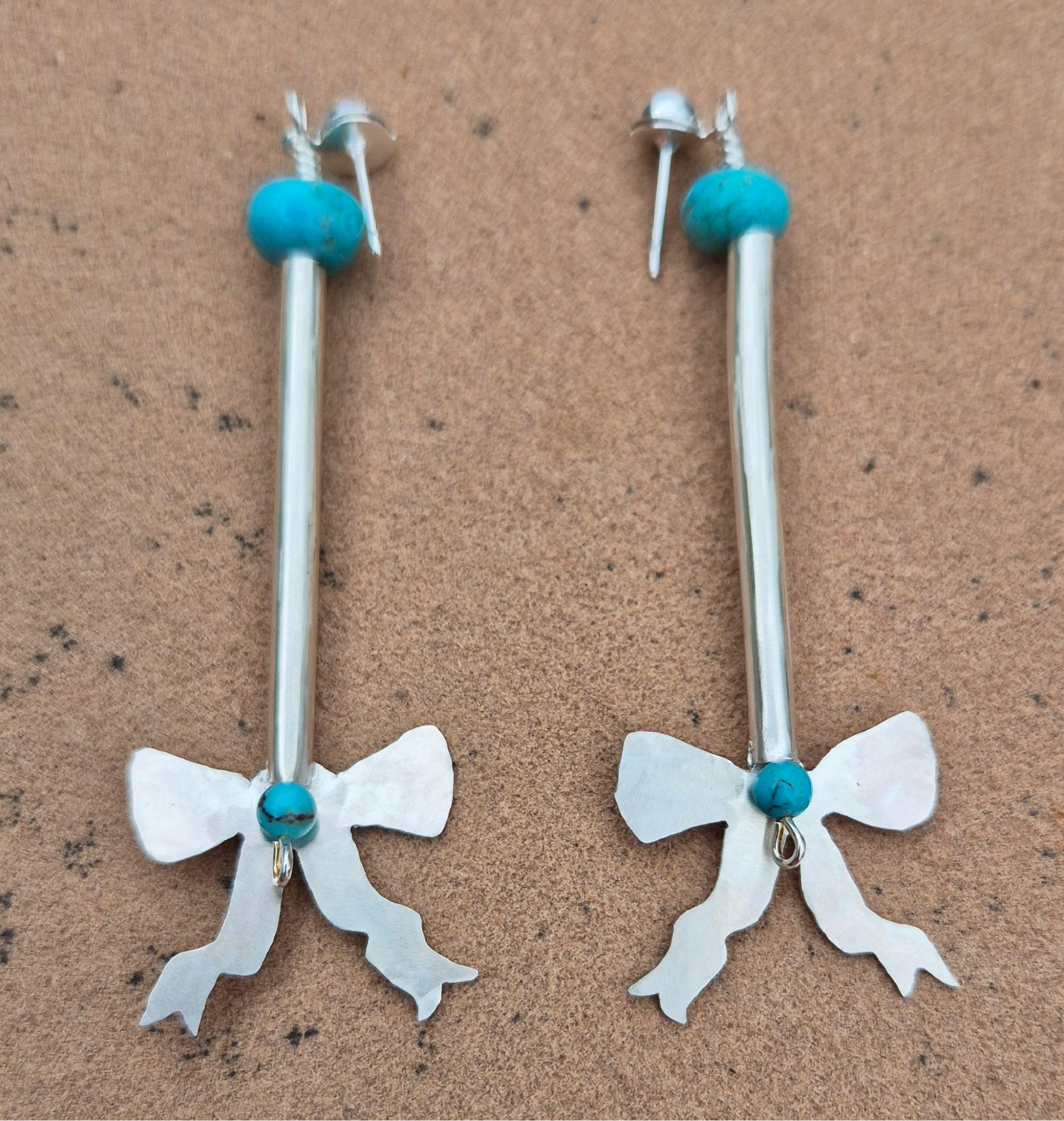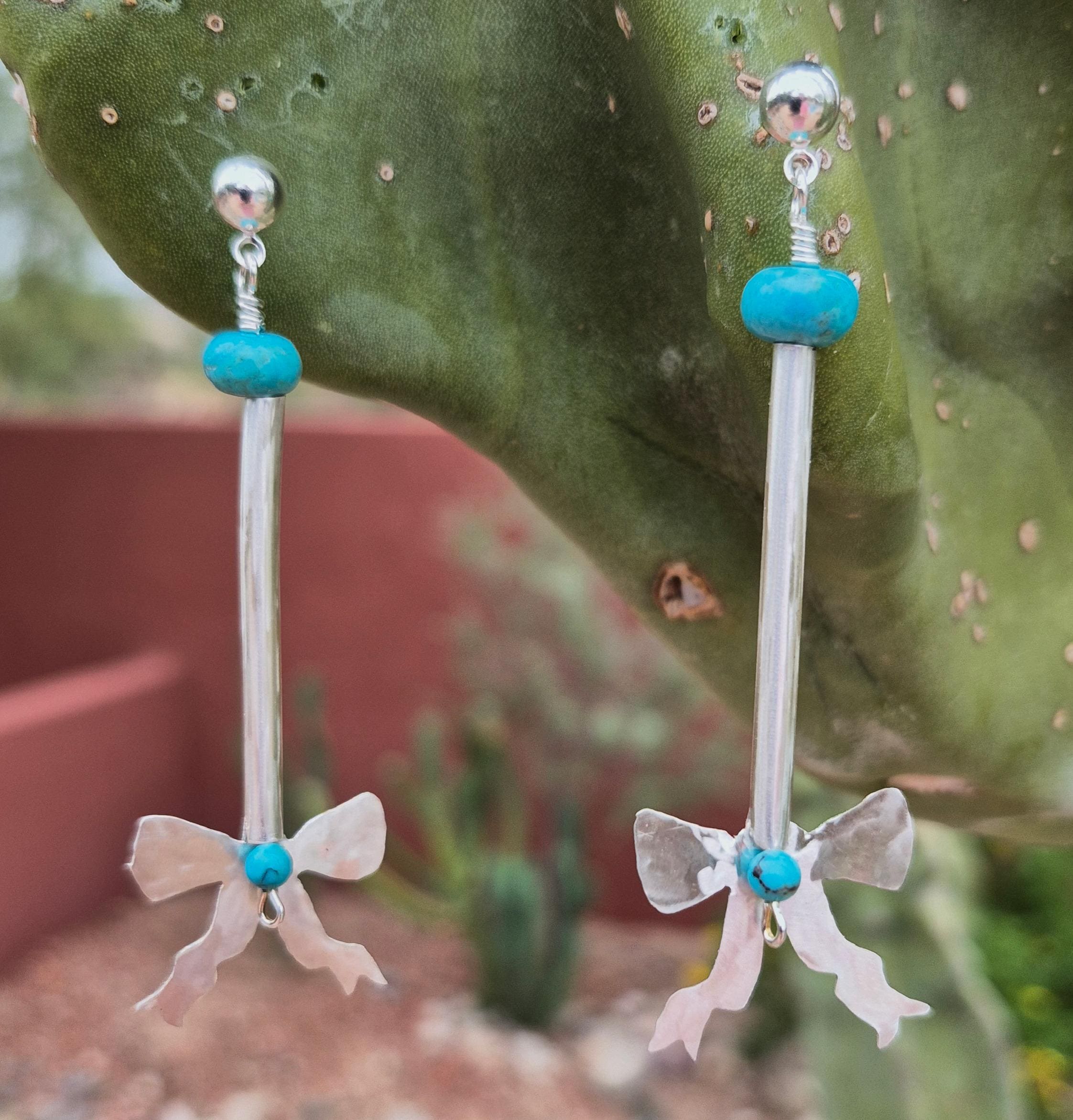 Sweet silver bows hang below a silver pole capped off with striking Kingman turquoise beads. These are really eye-catching earrings that are approximately 3" long x 1" wide and super light-weight.